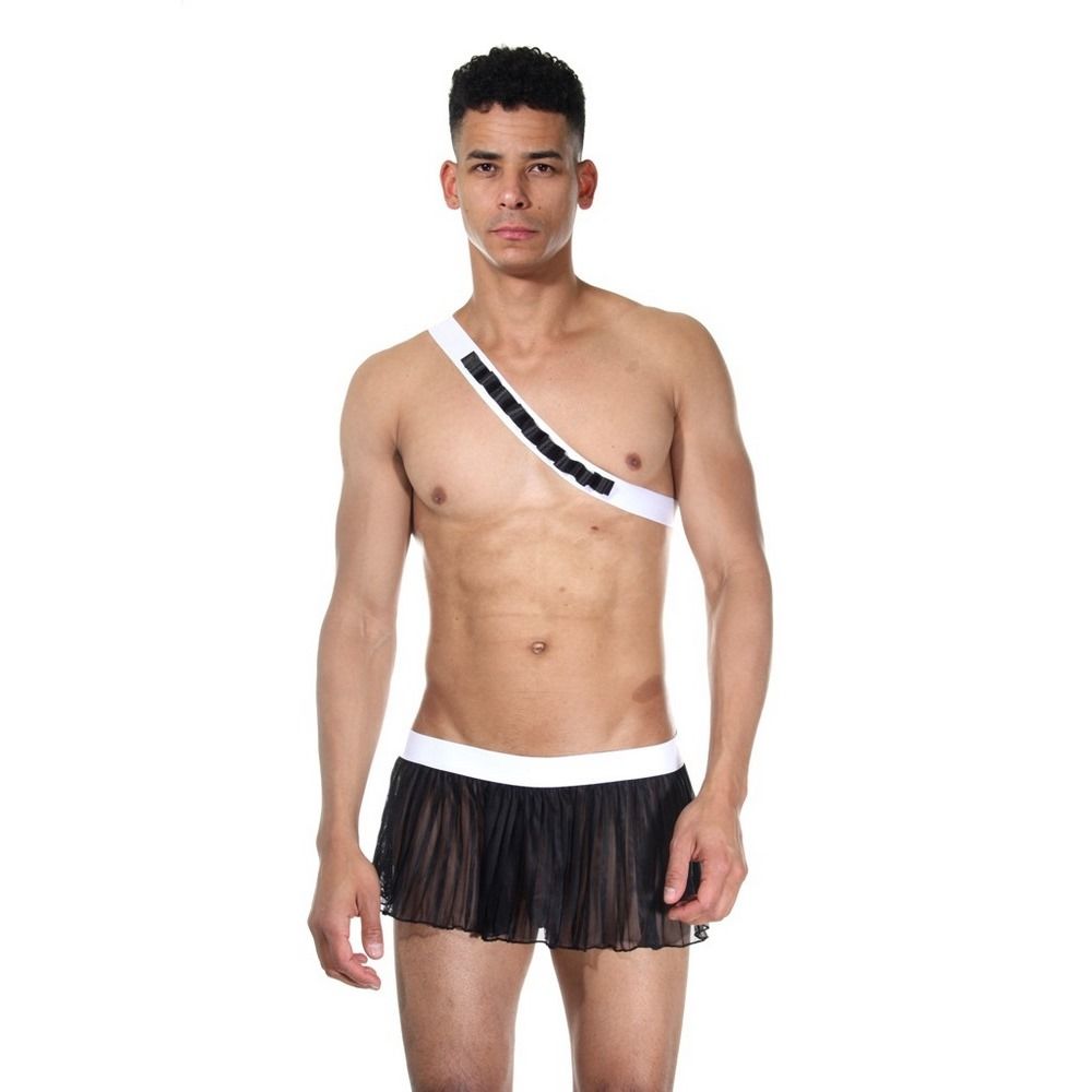 Эротичный костюм для мужчин, состоящий из черной плиссированной юбки на белом поясе с открытыми ягодицами и черно-белой повязки, которая одевается на верхнюю часть тела. В комплекте: юбка, наплечник.