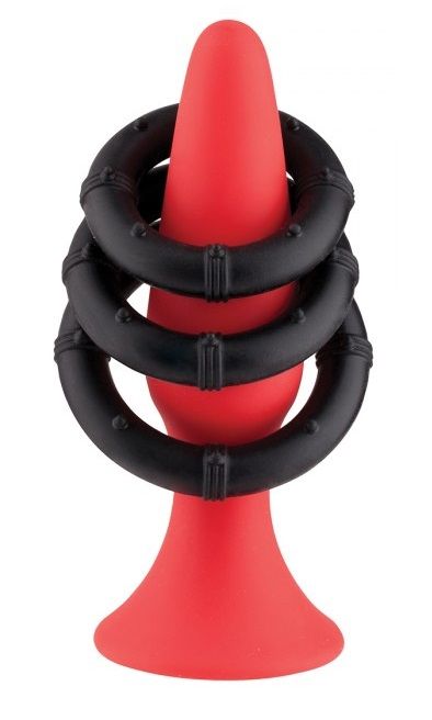 Красный плаг для анальной стимуляции из силикона. В наборе 3 черных силиконовых кольца, которые можно использовать на пенисе и мошонке. Диаметр колец - 3, 3,5 и 4 см. Рабочая длина пробки - 10 см., диаметр - 3 см.